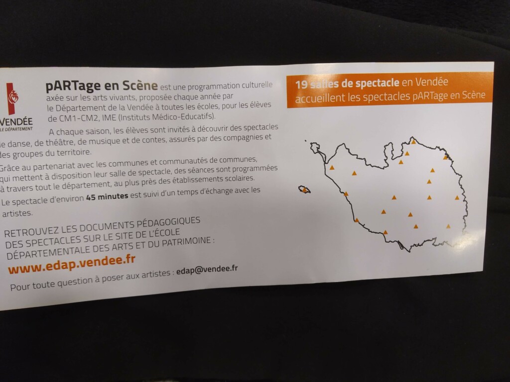 Dans le cadre de la programmation culturelle “pARTage en Scène”, les élèves de CM1-CM2 ont assisté à une représentation théâtrale le mardi 4 mars 2025 à la salle Othello de Mareuil-sur-Lay. Cette initiative, proposée annuellement par le département de la Vendée, vise à offrir une expérience enrichissante dans le domaine des arts vivants à tous les CM1-CM2 de Vendée.