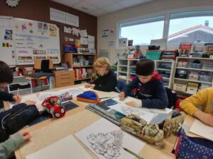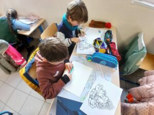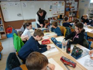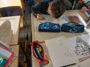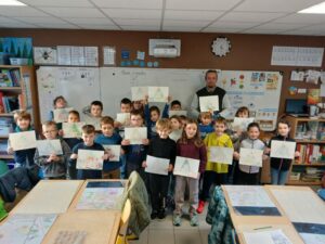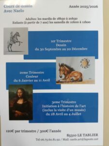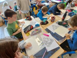 Début décembre, les deux classes du Tablier ont rencontré l’artiste Naelo. Artiste local, puisqu’il vit sur la commune. Nous avons dans un premier temps découvert ses œuvres qui étaient exposées à la Grange. Ensuite, en classe, il a donné un cours de dessin sur le thème de Noël. C’était très intéressant. Les enfants ont apprécié.