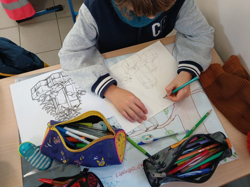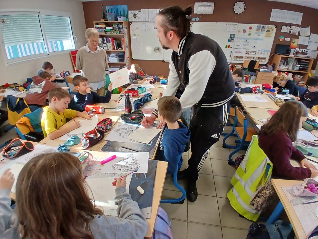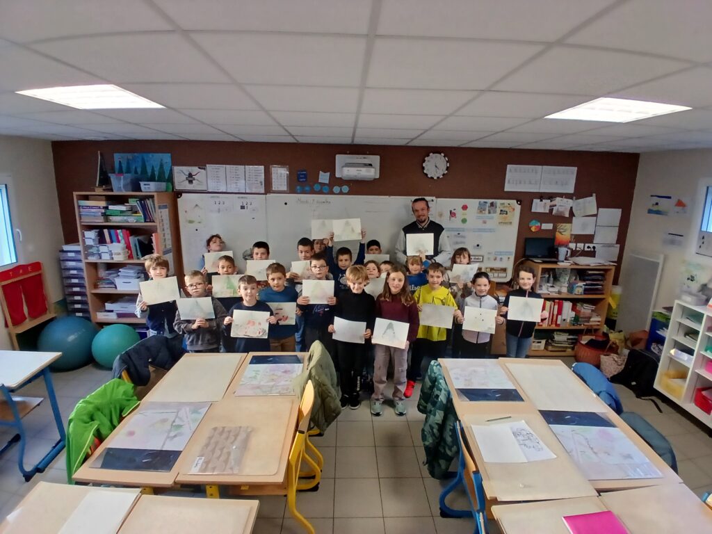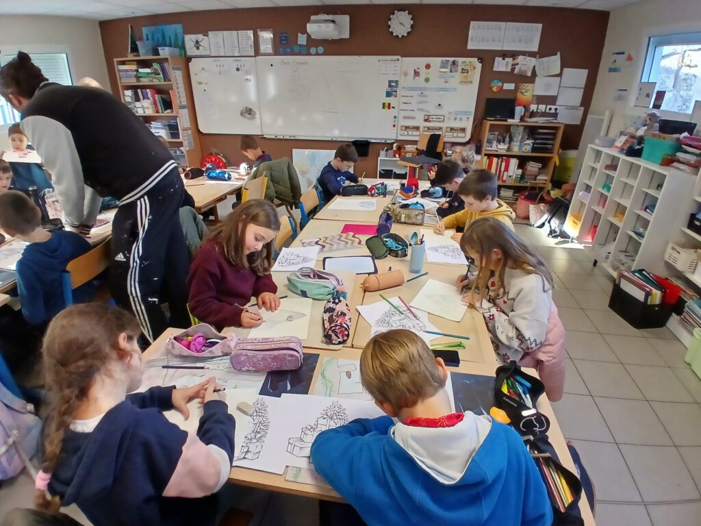 Début décembre, les deux classes du Tablier ont rencontré l’artiste Naelo. Artiste local, puisqu’il vit sur la commune. Nous avons dans un premier temps découvert ses œuvres qui étaient exposées à la Grange. Ensuite, en classe, il a donné un cours de dessin sur le thème de Noël. C’était très intéressant. Les enfants ont apprécié.