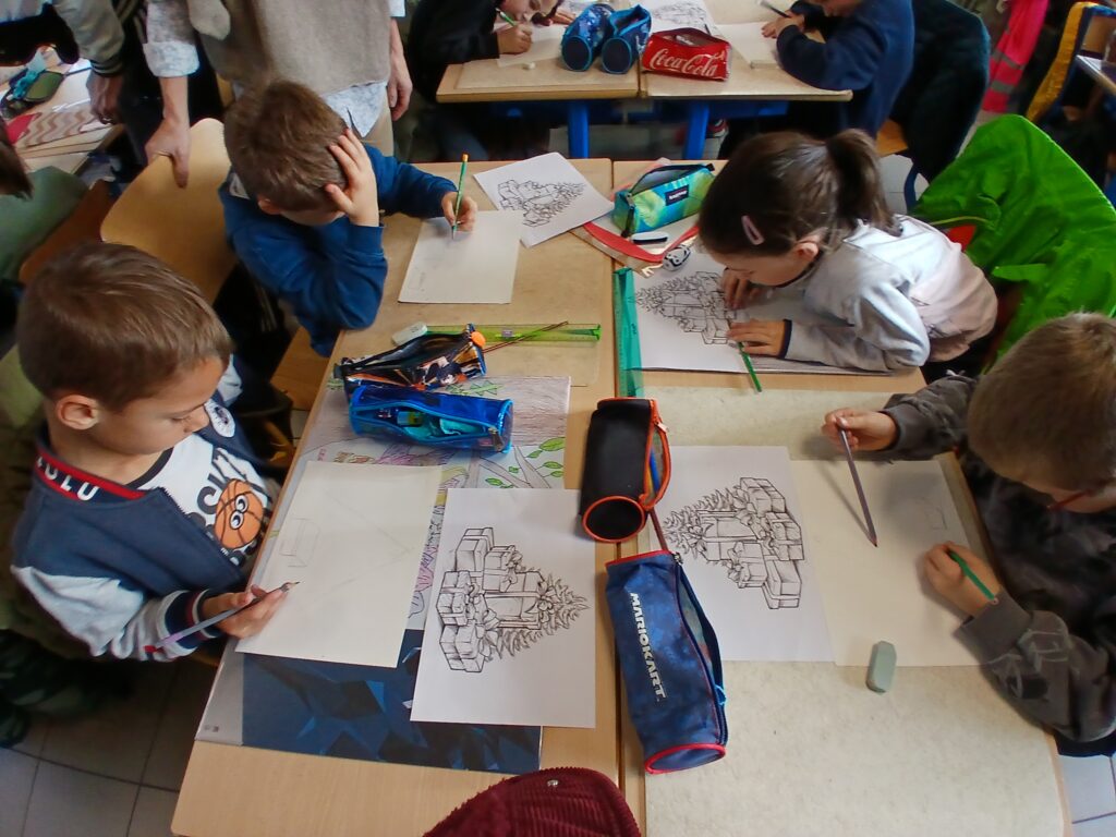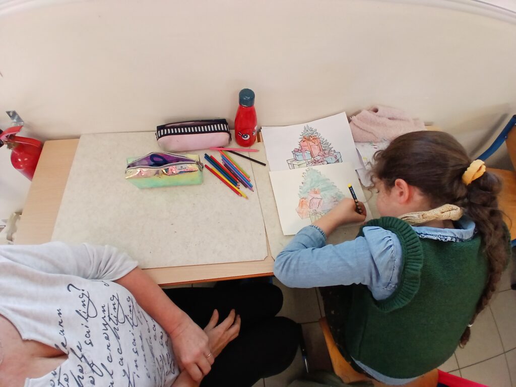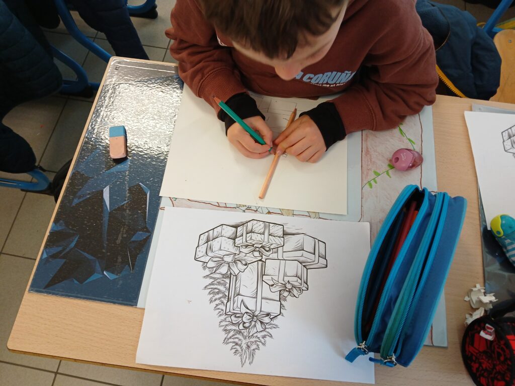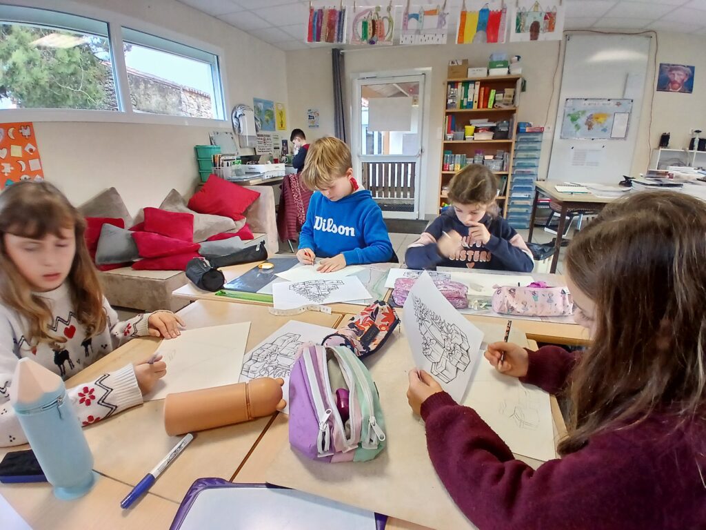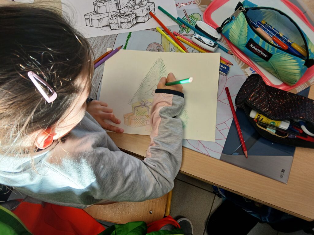 Début décembre, les deux classes du Tablier ont rencontré l’artiste Naelo. Artiste local, puisqu’il vit sur la commune. Nous avons dans un premier temps découvert ses œuvres qui étaient exposées à la Grange. Ensuite, en classe, il a donné un cours de dessin sur le thème de Noël. C’était très intéressant. Les enfants ont apprécié.