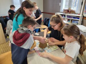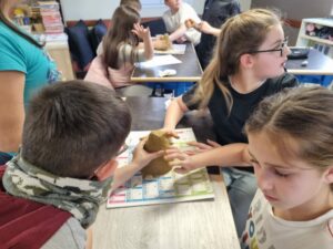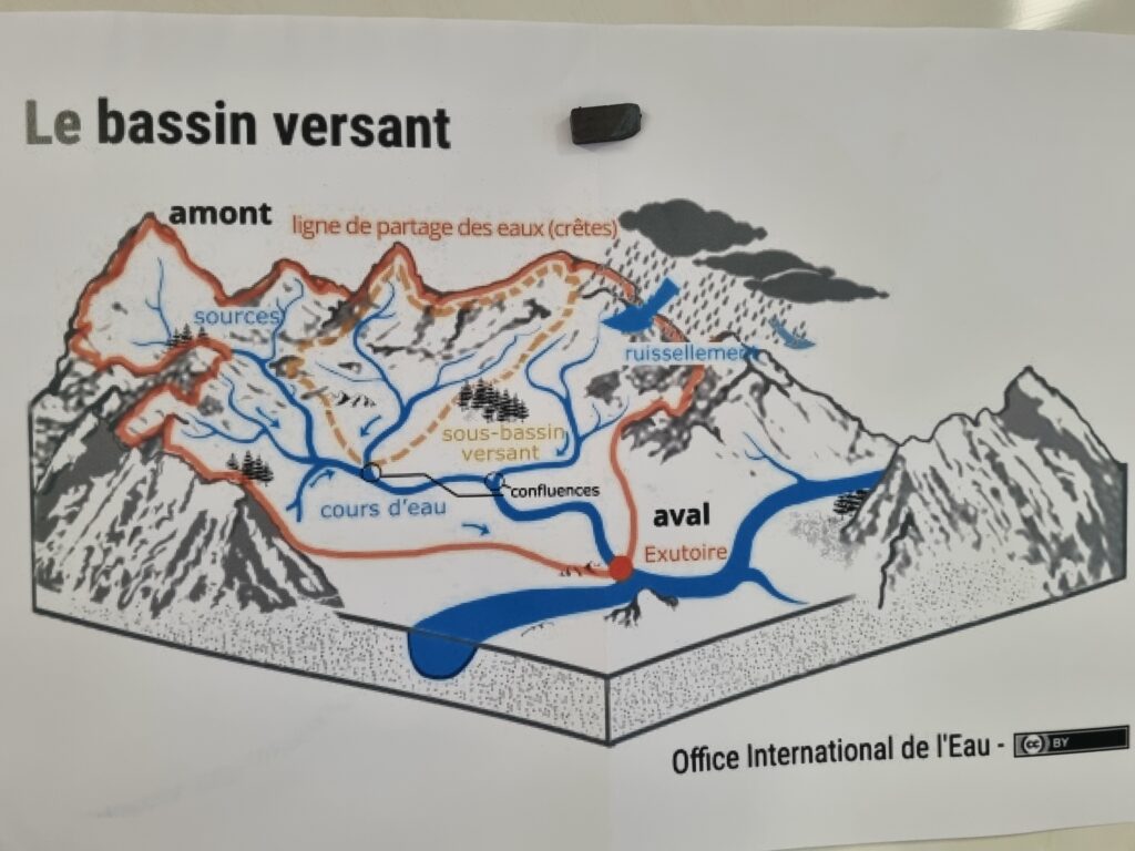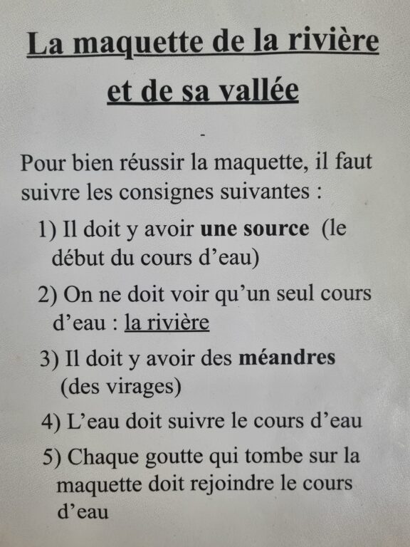 Une fois notre maquette terminée, nous y avons versé de l’eau pour observer son trajet. L’expérience nous a permis de vérifier si l’eau s’écoulait correctement vers la rivière. Cette activité pratique et ludique nous a aidés à mieux comprendre le fonctionnement des bassins versants et le chemin de l’eau dans la nature.