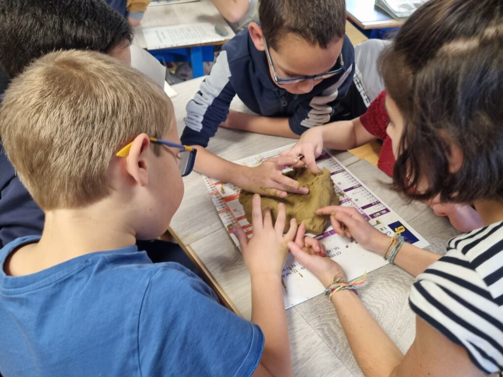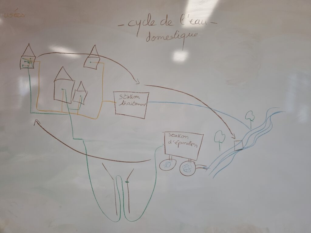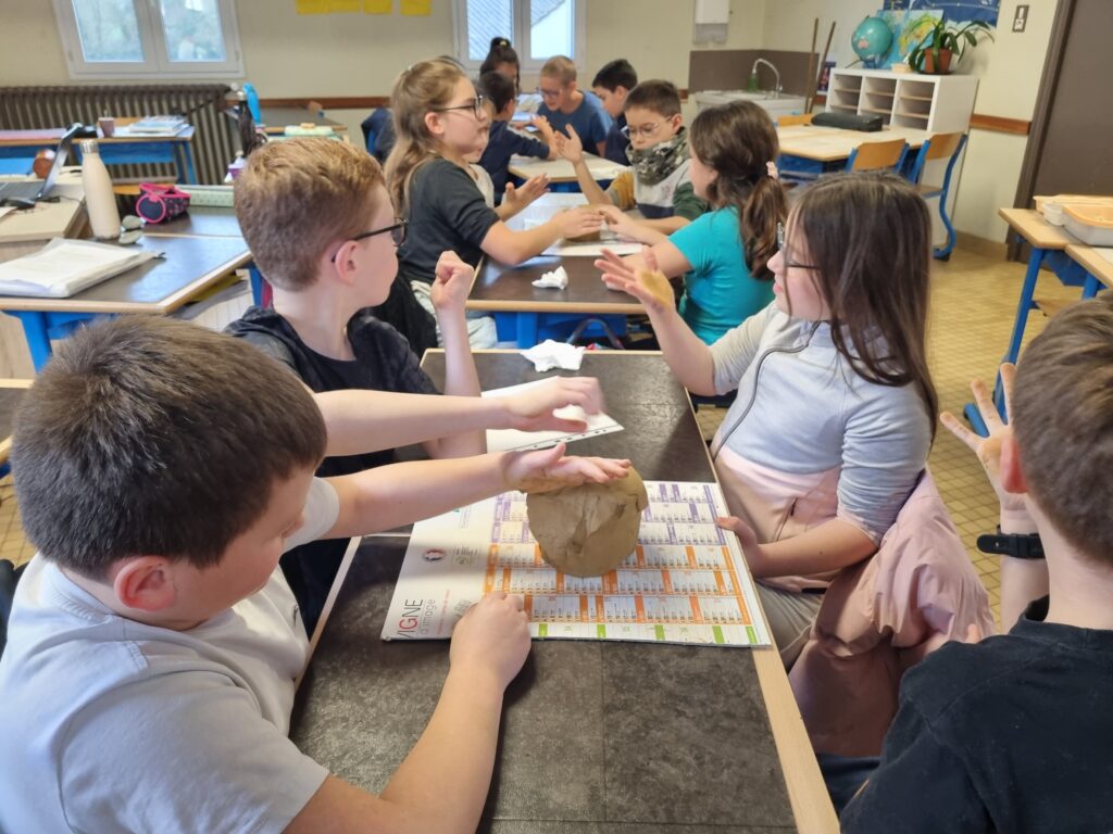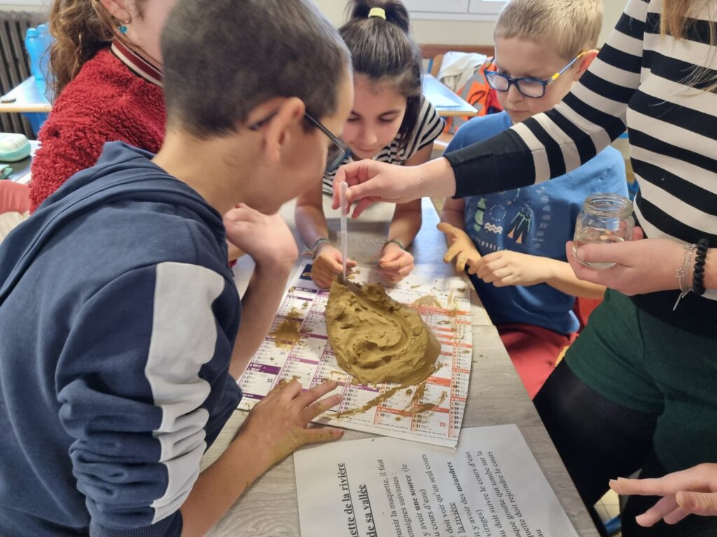 Pour approfondir nos connaissances, nous avons réalisé des schémas afin de visualiser le parcours de l’eau. Ensuite, par groupes de quatre ou cinq élèves, nous avons modelé un bassin versant à l’aide d’argile. Nous avons façonné une chaîne de montagnes, une vallée et creusé une rivière.