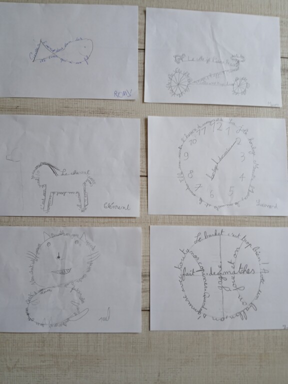 L’expression des passions : Dans un second temps, les enfants ont laissé libre cours à leur imagination. À partir d’un texte personnel sur leurs propres passions (sport, musique, loisirs…), chacun a inventé son propre calligramme, transformant ses mots en formes originales et uniques (Cf photos). Bravo aux enfants et merci aux bénévoles.