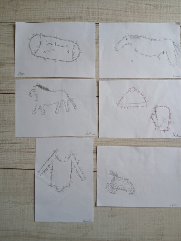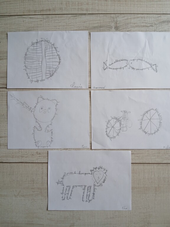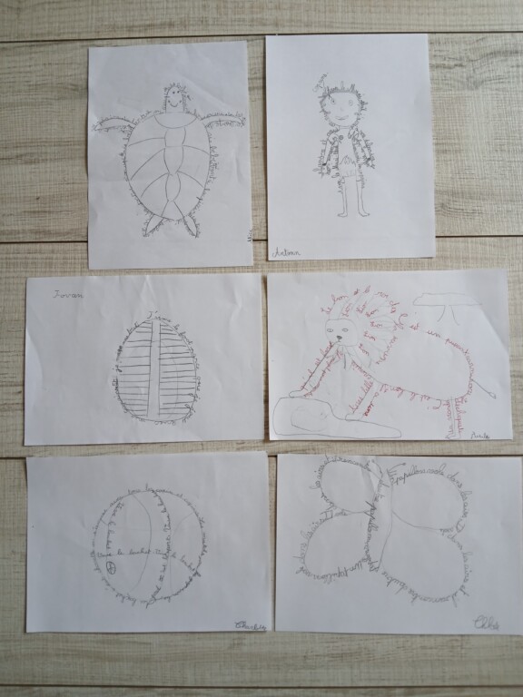 Le bestiaire poétique : Pour s’échauffer, les élèves ont d’abord écrit des poèmes sur le thème des animaux. Sous leurs plumes, les phrases se sont courbées pour dessiner différents animaux.